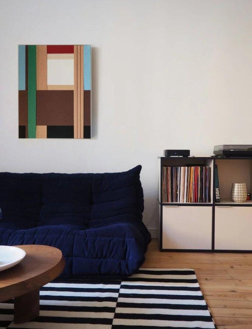Finally found the perfect piece for this wall! I was worried about finding something that worked with my blue sofa, but these colors are spot on. It adds such a cool texture to the room. Love it!