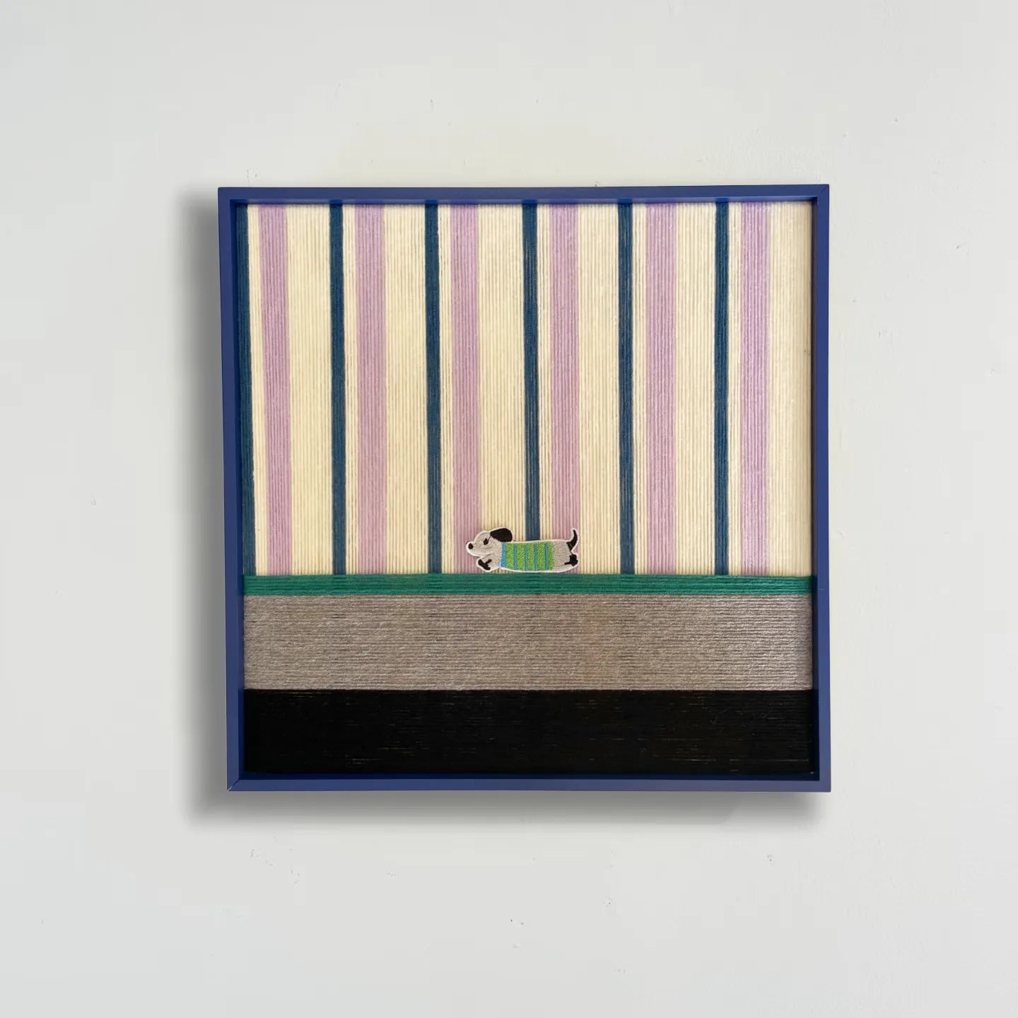 The Vibe: Whimsical Energy & Retro Stripes "Cerulean Stripe Pup Frolic" brings a lighthearted, vintage charm to your wall, capturing the fun of a playful puppy. This structural art piece is created through the meticulous technique of hand-wrapped yarn. The background is filled with vertical stripes of soft cerulean blue, lilac pink, and creamy yellow, creating a cheerful, retro atmosphere. The lower section anchors the piece with layers of moss green, light grey, and deep black yarn, suggesting grass and shadow. The focal point is a delightful dachshund appliqué wearing a green and blue striped sweater, mid-frolic.