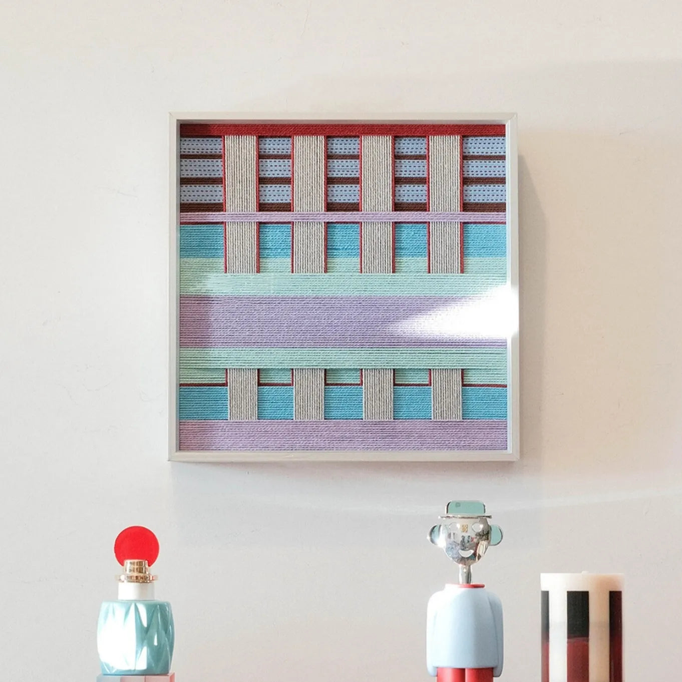 Front view of Hanosen Anji yarn woven wall art on plain white background, showing exact square proportions and clean pastel grid pattern