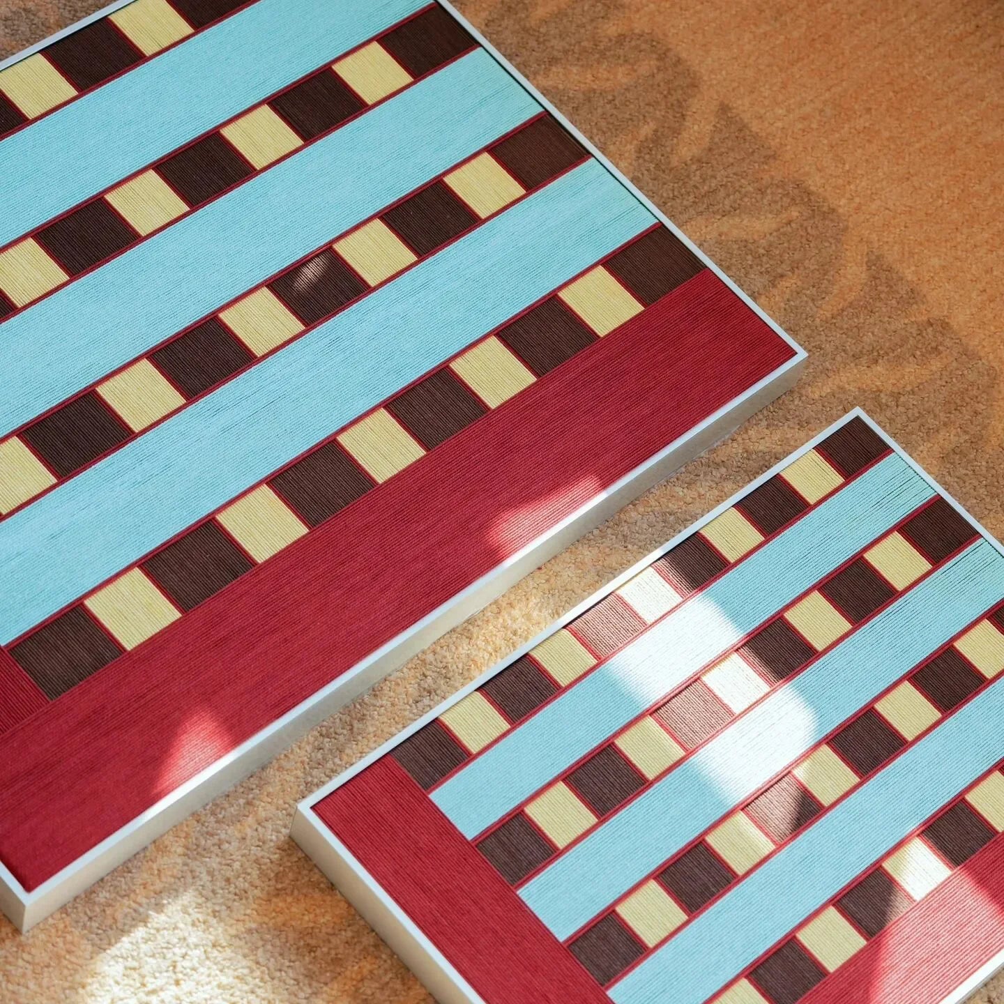 The Vibe: Mediterranean Passion & Cool Breeze "Malèna: A Sicilian Beauty" evokes the timeless allure of the Italian coast. This structural art piece is created through the meticulous technique of hand-wrapped yarn. The composition is framed by a bold, L-shaped border of deep burgundy red, representing the heat and passion of Sicily. Inside, serene horizontal bands of cool light blue (the sea) alternate with a rhythmic geometric pattern of cream and dark brown squares, resembling classic tiled floors or woven vintage fabrics.