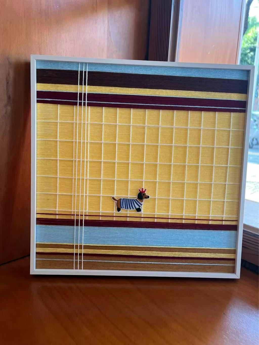 The Vibe: Playful Charm & Cozy Texture "Pawsy Puppy" is a whimsical piece that brings playful, pet-inspired charm to any room. This art piece is created through the meticulous technique of hand-wrapped yarn. The main body is a field of bright sunny yellow, overlaid with a delicate diamond grid formed by thin white strings. The composition is framed by graphic blocks of dark brown, sky blue, and deep maroon, creating a cozy, plaid-like effect. A charming striped puppy patch provides a delightful focal point.
