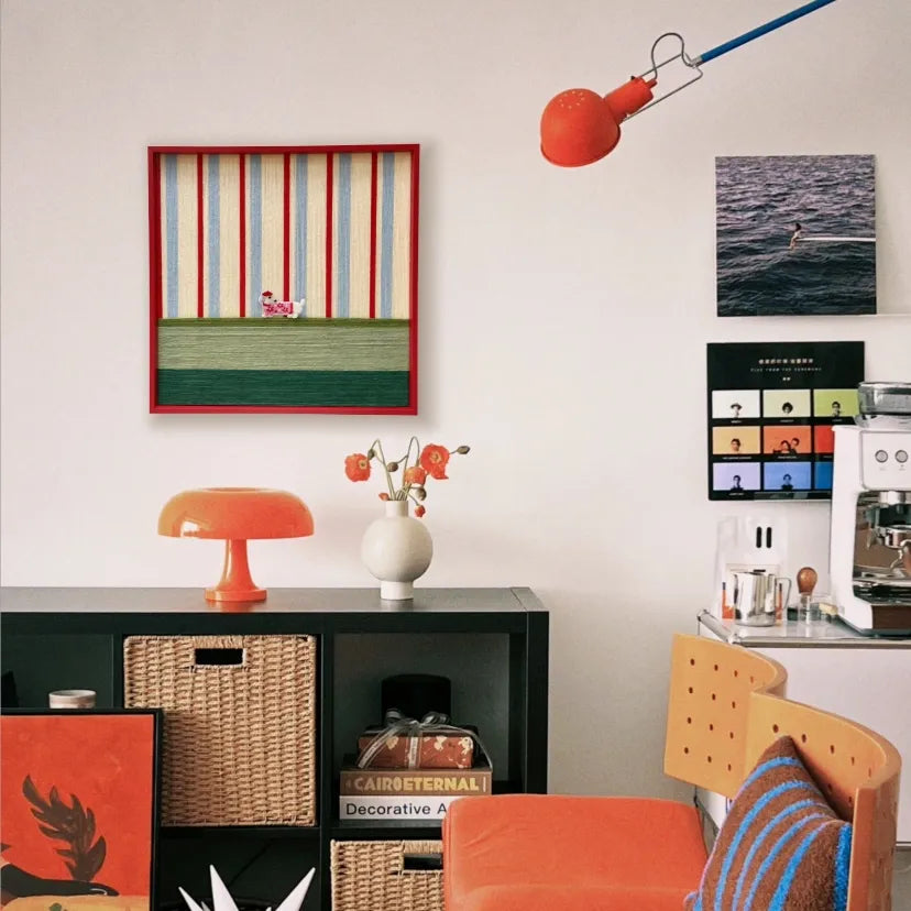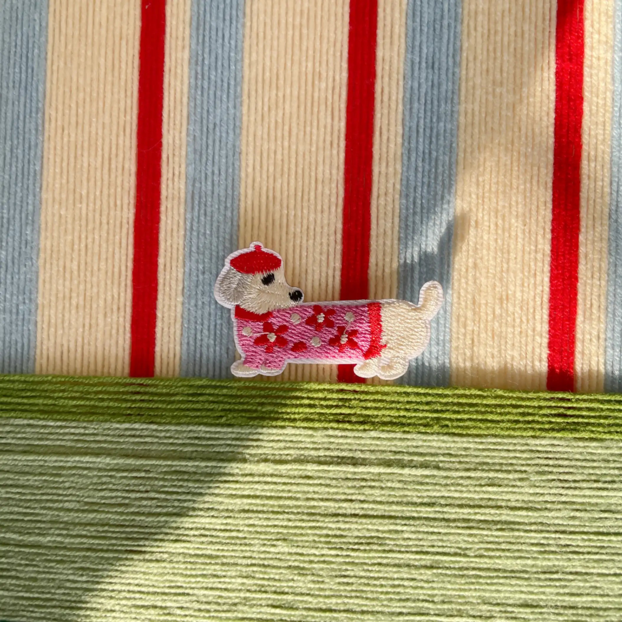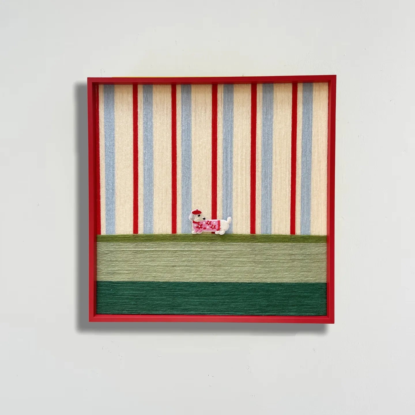 The Vibe: Playful Charm & Cozy Afternoon "Scarlet Stripe Pup Saunter" brings a moment of lighthearted charm and cozy texture to your wall. This structural art piece is created through the meticulous technique of hand-wrapped yarn. The background is dominated by bold, vertical stripes of scarlet red, classic blue, and creamy beige, reminiscent of a quaint wallpaper or circus tent. The lower portion features a textured block of moss green (the lawn). Adding a whimsical focal point is a decorative dachshund appliqué wearing a pink floral sweater and red hat.